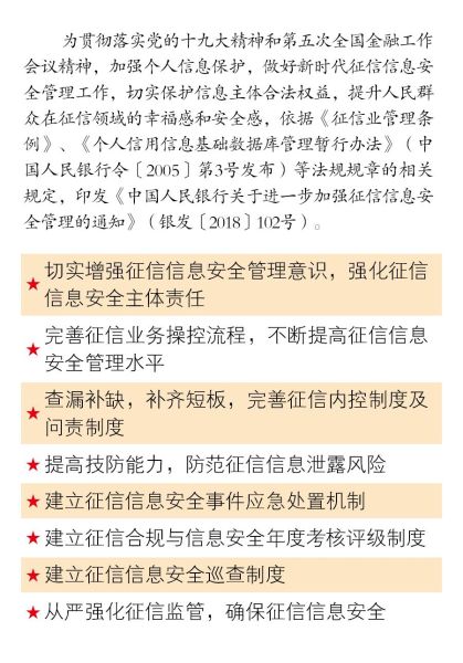 今年4月印發的《中國人民銀行關于進一步加強征信信息安全管理的通知》(銀發〔2018〕102號),要求提升征信信息安全問題認識,加強制度、監管、技術等方面的建設,補齊短板,從嚴問責,切實保護信息主體權益,確保不發生征信信息安全事件。